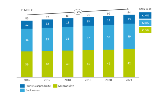 In Europa lässt sich in den nächsten Jahren ein Umsatzwachstum des Frühstück-Marktes von 2% feststellen. Während sich der Umsatz von Milch- und Frühstücksprodukten in den kommenden Jahren nur schwach erhöhen wird, erfährt der Umsatz von Brot und Backwaren bis zum Jahr 2021 ein doppelt so starkes Wachstum.