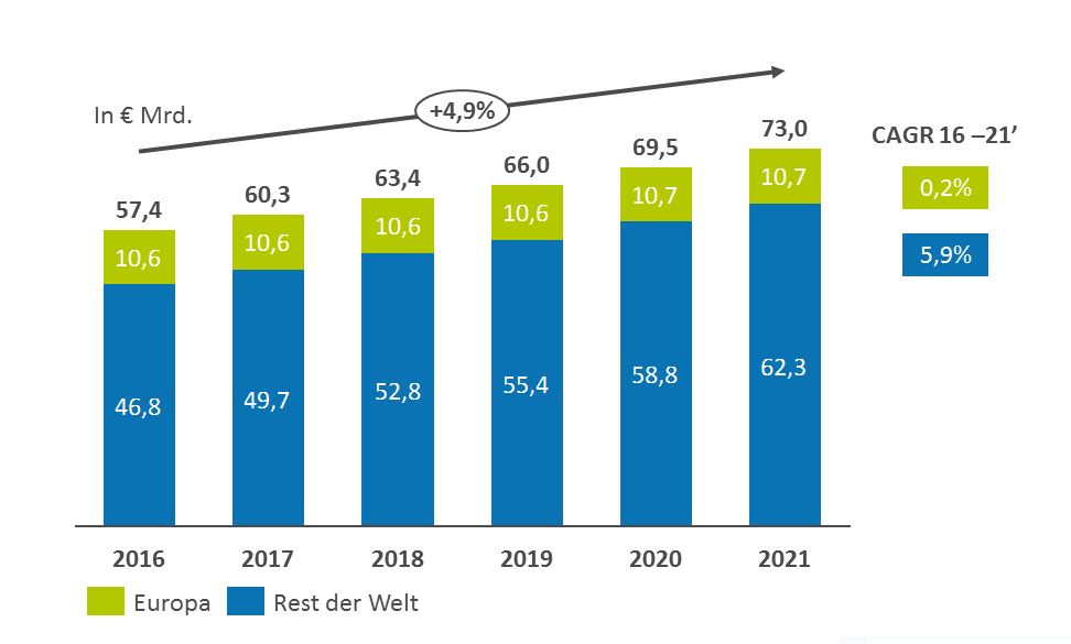 Prognose für das Marktvolumen des globalen in vitro Diagnose Marktes für die Jahre 2016-2021. Eine Unterteilung findet zwischen Europa und dem Rest der Welt statt
